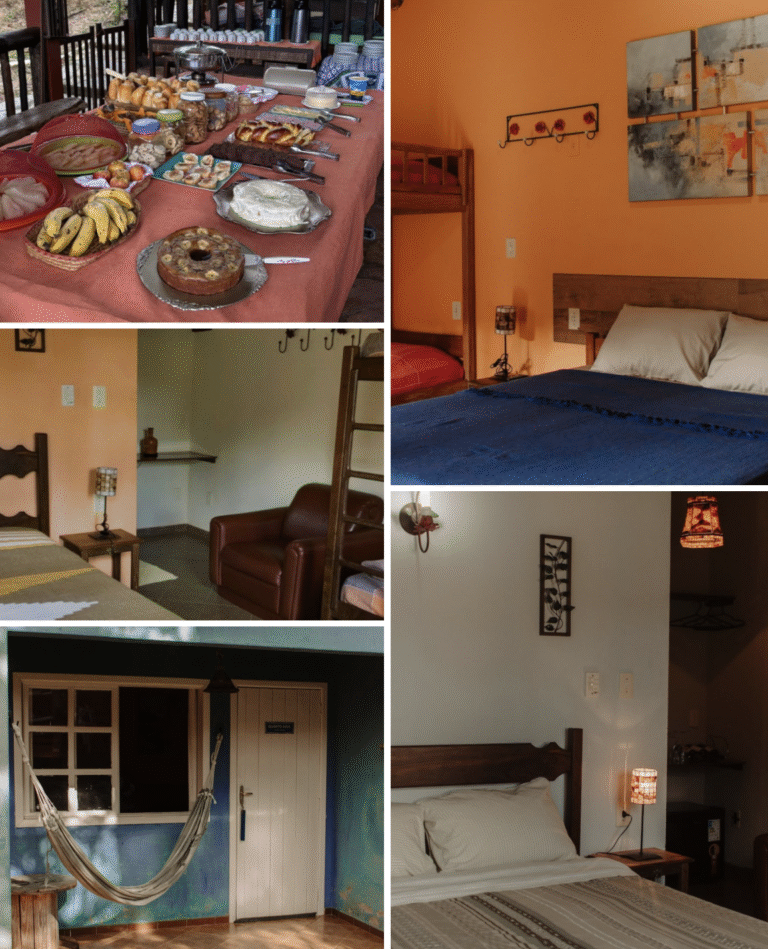 Pousada com quartos compartilhados, banheiros e café da manhã. A pousada também disponibilizada roupa de cama e banho, frigobar e wifi.